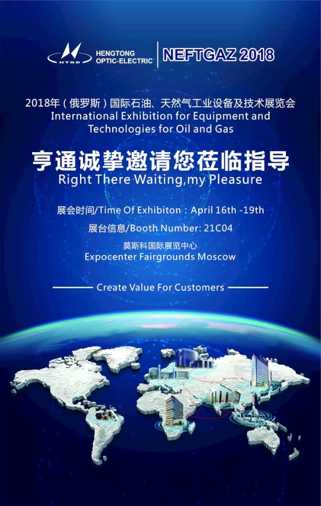 Hengtong Rus LLC, on behalf of HENGTONG OPTIC-ELECTRIC, invites everyone to visit our booth No. 21С04 at the NEFTEGAZ 2018 exhibition; it will run on 16-19 April 2018 at Expocentre Fairgrounds in Moscow.