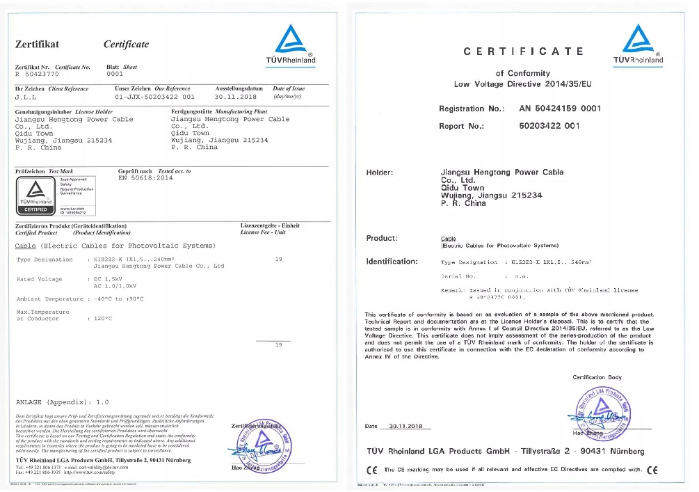 Hengtong deeply knows how important the quality of the products is to our customers and also ourselves. This qualification conducted by TÜV Rheinland, approval of EN50618 certificate and low voltage 2014/35/EU instruction CE certification certificate, as well as achieved international level inspection requirements, which reflected that Hengtong manufacture’s high quality.