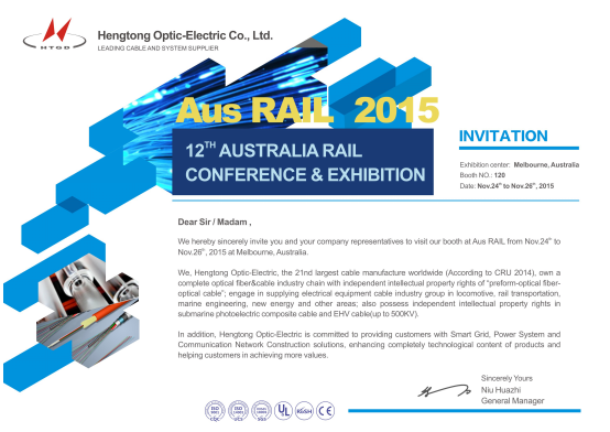 Hengtong was invited to Aus RAIL on 24th 2015,and the exhibition will end at 26th. Hengtong Optic-Electric is committed to providing customers with Smart Grid, Power System and Communication Network Construction solutions, enhancing completely technological content of products and helping customers in achieving more values.