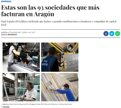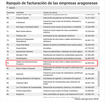 ZARAGOZA, November 30 (Cablescom)--Cablescom is once again among the 93 companies in the ranking of businesses with the highest turnover in 2018 in Aragon, which is a source of pride for all of us who are part of the team.